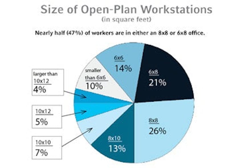 As companies seek to trim the fat from their portfolios of leased and owned real estate, the average size of workstations continues to decrease. While the 10- by 10-foot (10x10) cubicle isn’t exactly extinct, it’s far from common today. Research conducted by Muscatine, IA-based furniture manufacturer Allsteel Inc. reveals that only 16 percent of workers are occupying spaces measuring 10x10 or larger; 8- by 8-feet (8x8) and 6- by 8-feet (6x8) are the most common workstation sizes. “If you do a better job of utilizing space and making it more efficient, then employees can be satisfied in a smaller workstation,” says Kelly Sterk, Allsteel’s workplace research manager.
